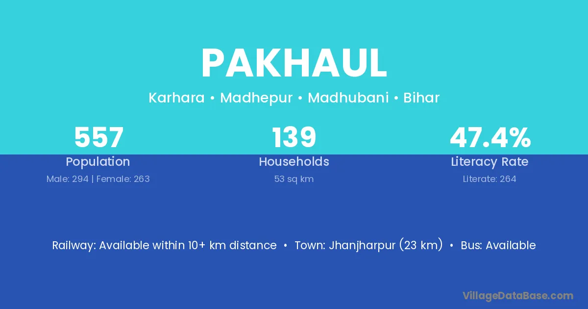 Jhanjharpur (23 km) is the nearest town to Pakhaul village for major economic activities and is located approximately 23 km away.