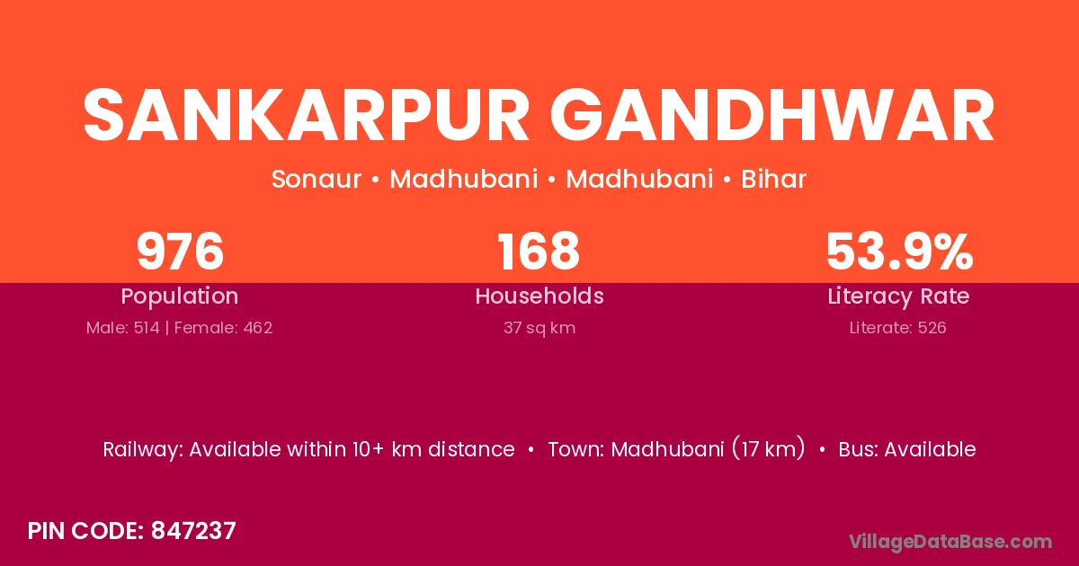 Madhubani (17 km) is the nearest town to Sankarpur Gandhwar village for major economic activities and is located approximately 17 km away.