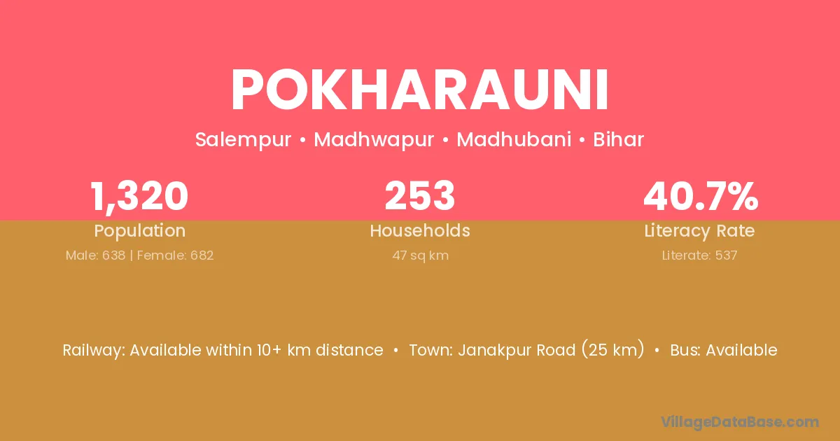 Pokharauni village has a total population of 1,320 people, of which 638 are males and 682 are females.