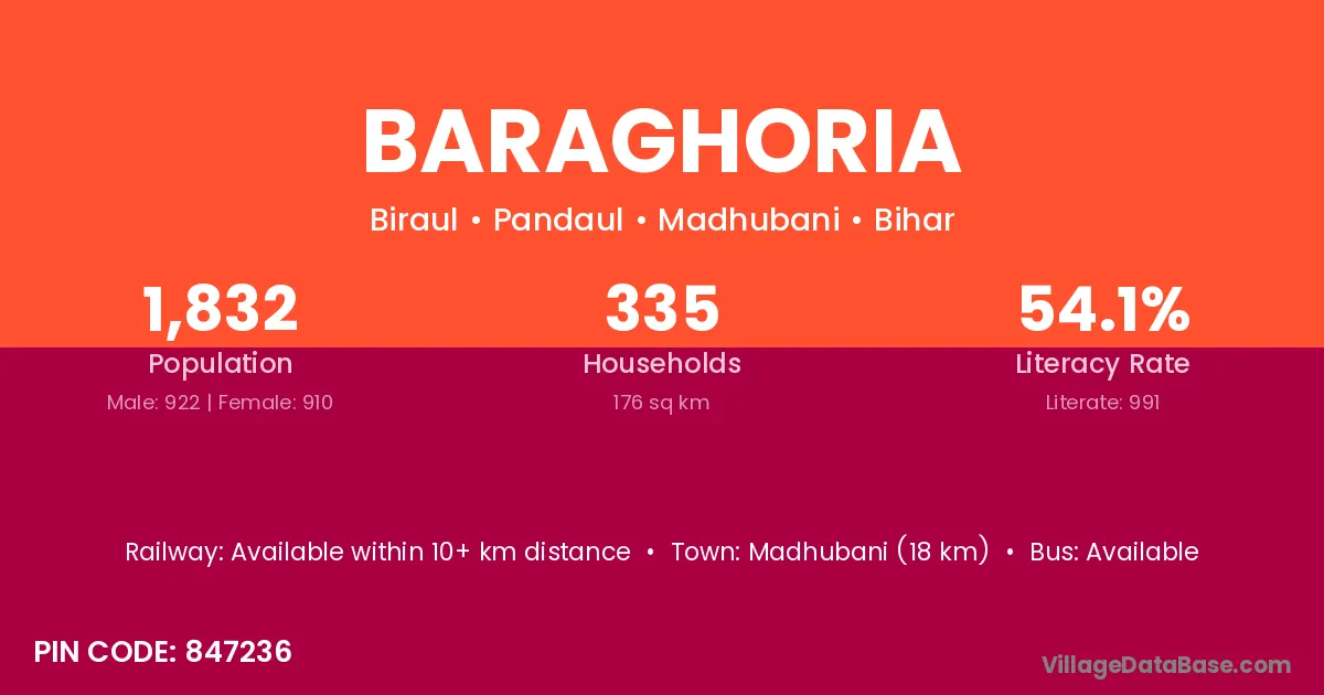 Madhubani (18 km) is the nearest town to Baraghoria village for major economic activities and is located approximately 18 km away.