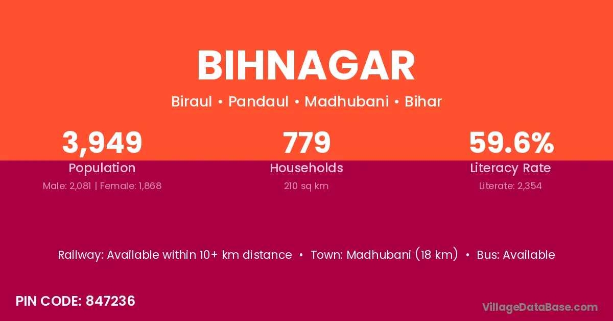 Madhubani (18 km) is the nearest town to Bihnagar village for major economic activities and is located approximately 18 km away.