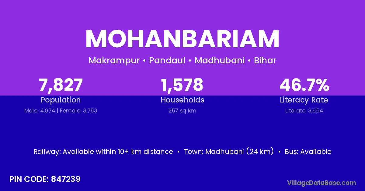Madhubani (24 km) is the nearest town to Mohanbariam village for major economic activities and is located approximately 24 km away.