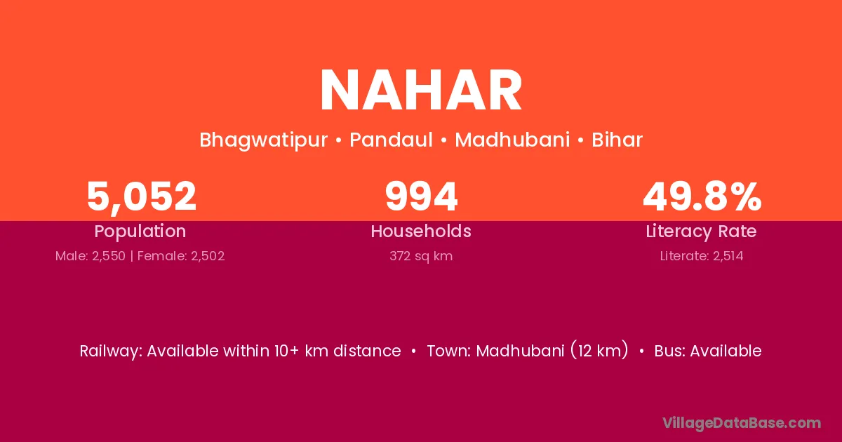 Madhubani (12 km) is the nearest town to Nahar village for major economic activities and is located approximately 12 km away.
