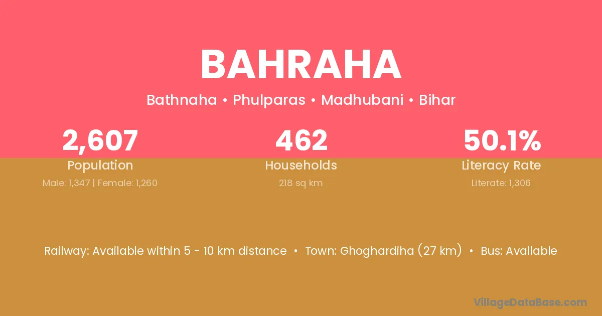 Ghoghardiha (27 km) is the nearest town to Bahraha village for major economic activities and is located approximately 27 km away.