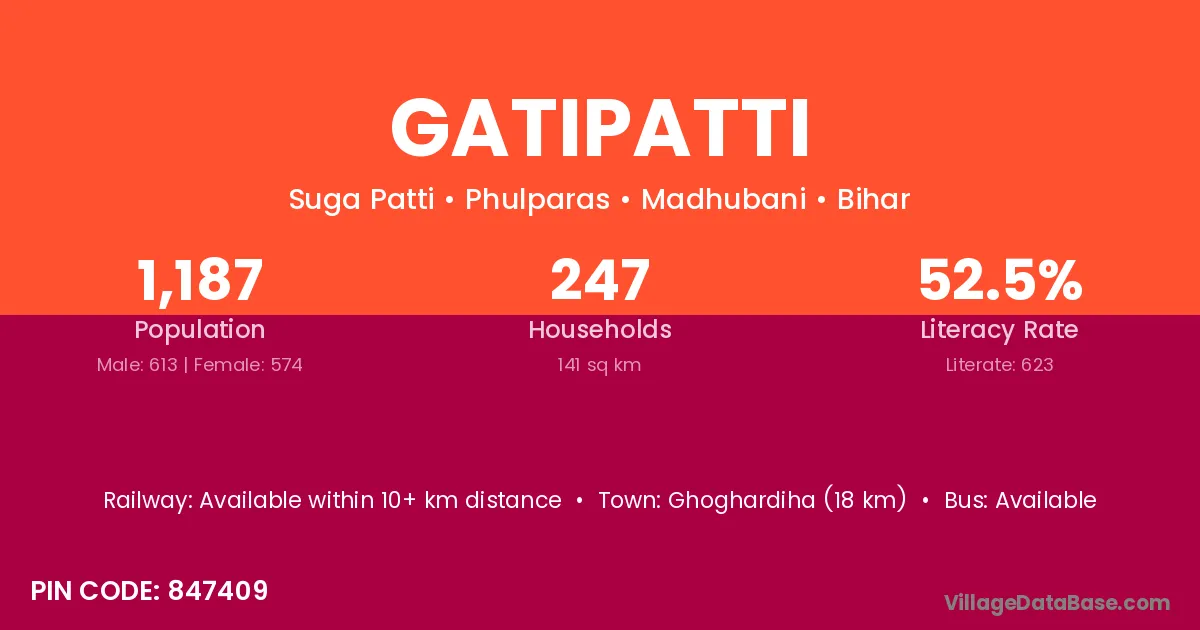 Ghoghardiha (18 km) is the nearest town to Gatipatti village for major economic activities and is located approximately 18 km away.