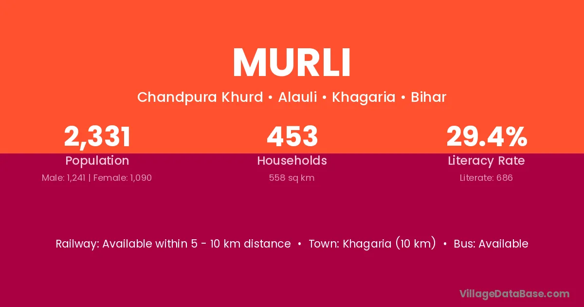 Ghoghardiha (12 km) is the nearest town to Murli village for major economic activities and is located approximately 12 km away.