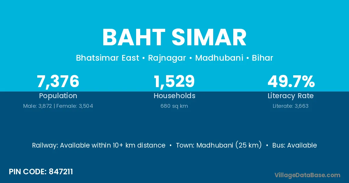 Madhubani (25 km) is the nearest town to Baht Simar village for major economic activities and is located approximately 25 km away.