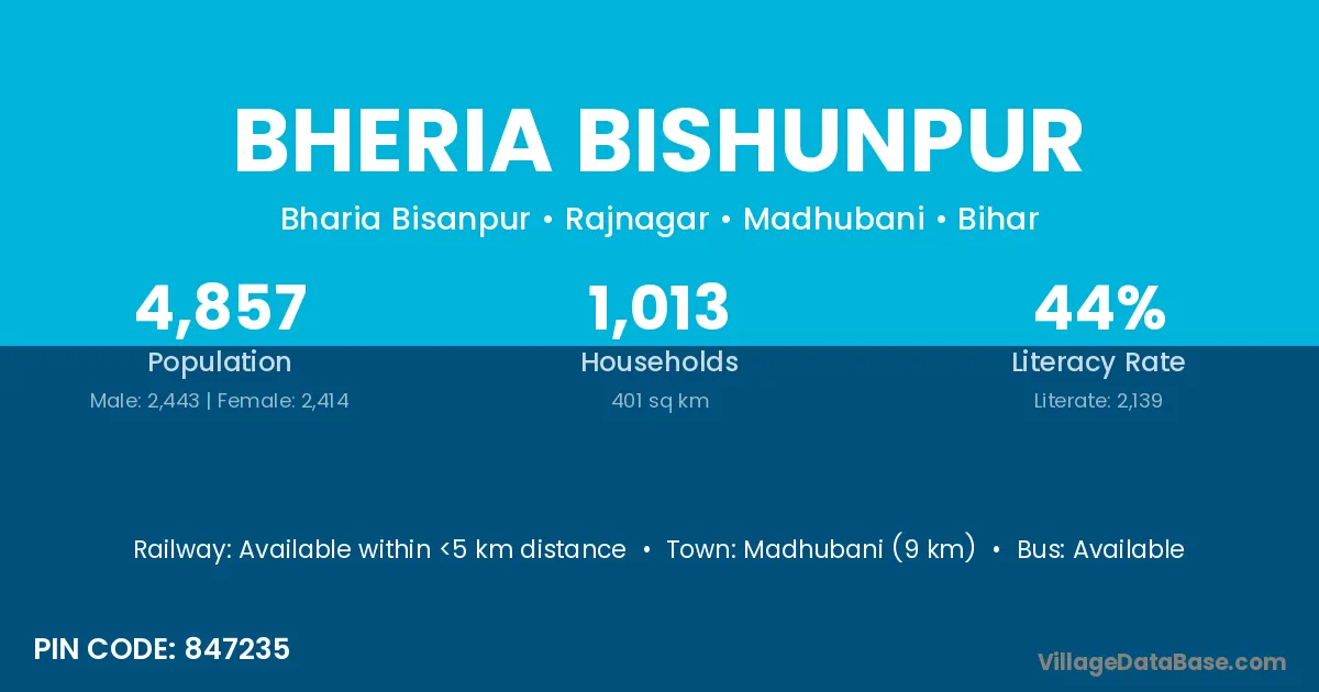 Madhubani (9 km) is the nearest town to Bheria Bishunpur village for major economic activities and is located approximately 9 km away.