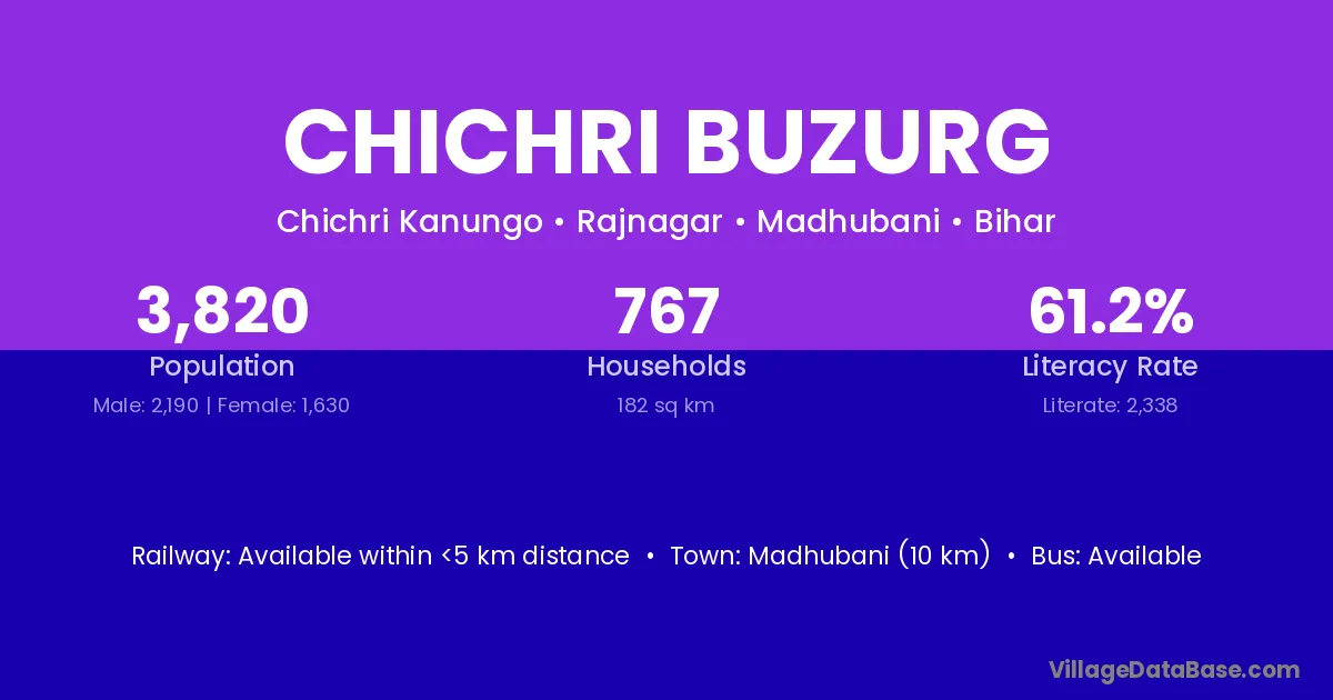 Madhubani (10 km) is the nearest town to Chichri Buzurg village for major economic activities and is located approximately 10 km away.