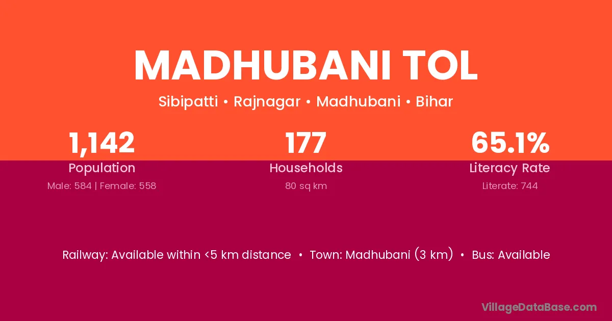 Madhubani (3 km) is the nearest town to Madhubani Tol village for major economic activities and is located approximately 3 km away.