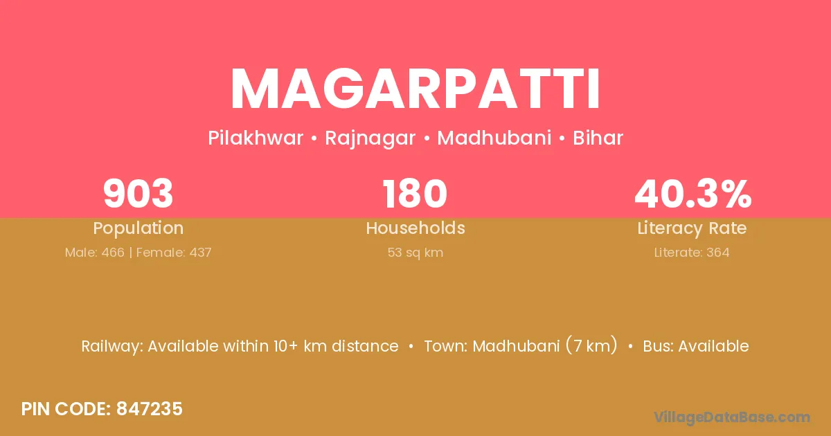 Madhubani (7 km) is the nearest town to Magarpatti village for major economic activities and is located approximately 7 km away.