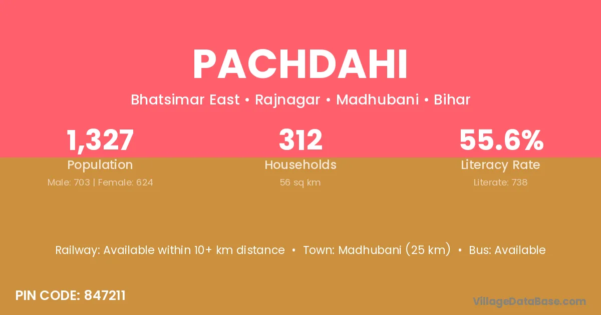 Madhubani (25 km) is the nearest town to Pachdahi village for major economic activities and is located approximately 25 km away.