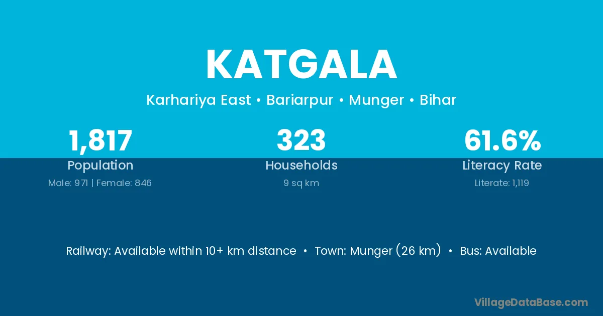 Munger (26 km) is the nearest town to Katgala village for major economic activities and is located approximately 26 km away.