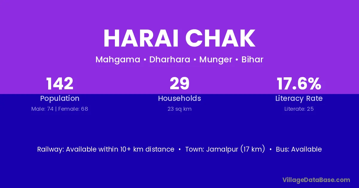 Jamalpur (17 km) is the nearest town to Harai Chak village for major economic activities and is located approximately 17 km away.