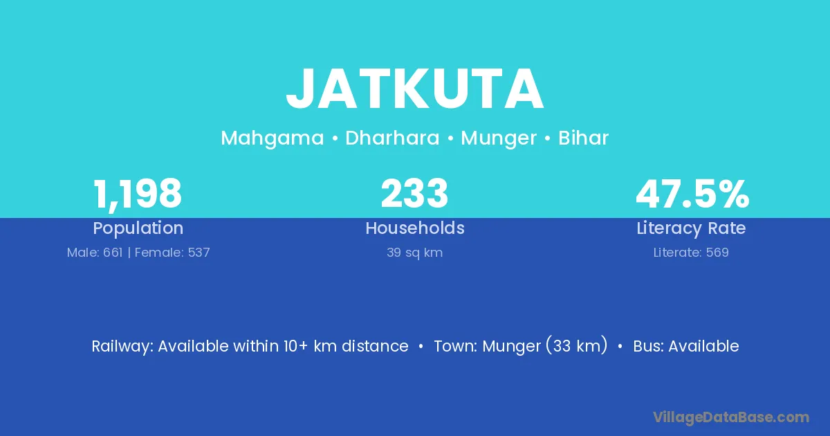 Munger (33 km) is the nearest town to Jatkuta village for major economic activities and is located approximately 33 km away.