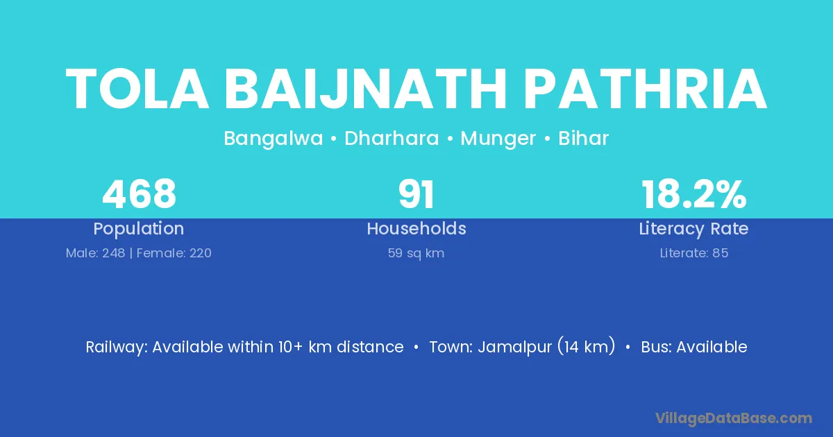 Jamalpur (14 km) is the nearest town to Tola Baijnath Pathria village for major economic activities and is located approximately 14 km away.