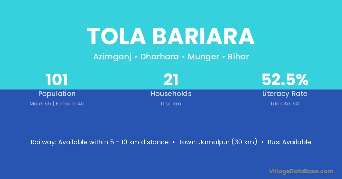 Jamalpur (30 km) is the nearest town to Tola Bariara village for major economic activities and is located approximately 30 km away.