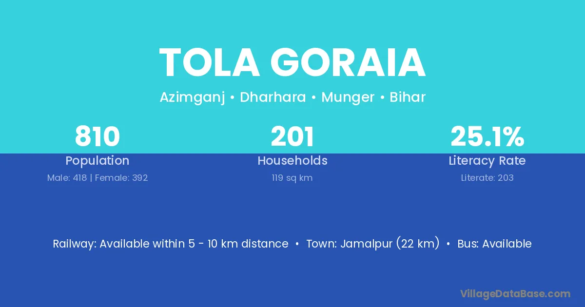Jamalpur (22 km) is the nearest town to Tola Goraia village for major economic activities and is located approximately 22 km away.