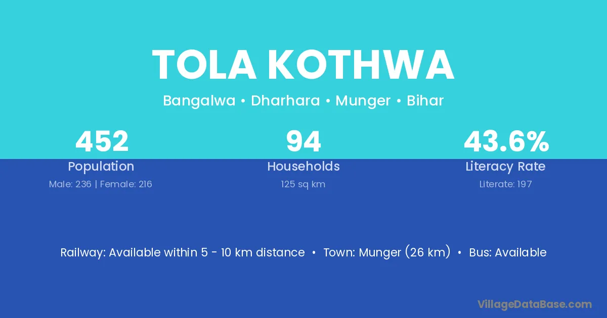Munger (26 km) is the nearest town to Tola Kothwa village for major economic activities and is located approximately 26 km away.