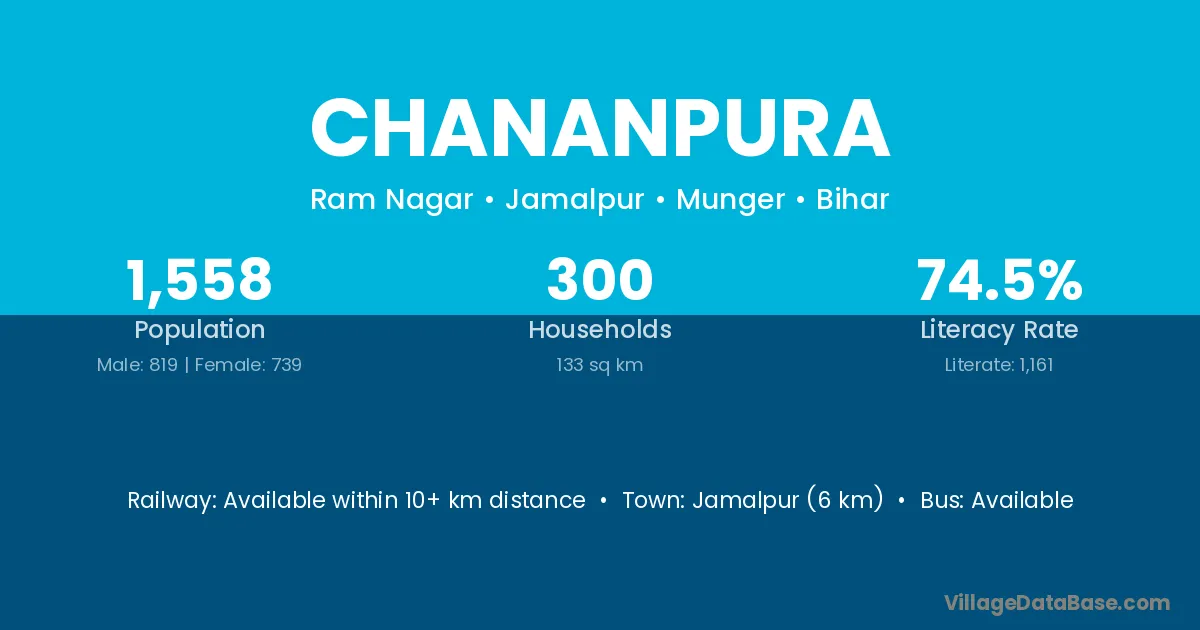 Jamalpur (6 km) is the nearest town to Chananpura village for major economic activities and is located approximately 6 km away.