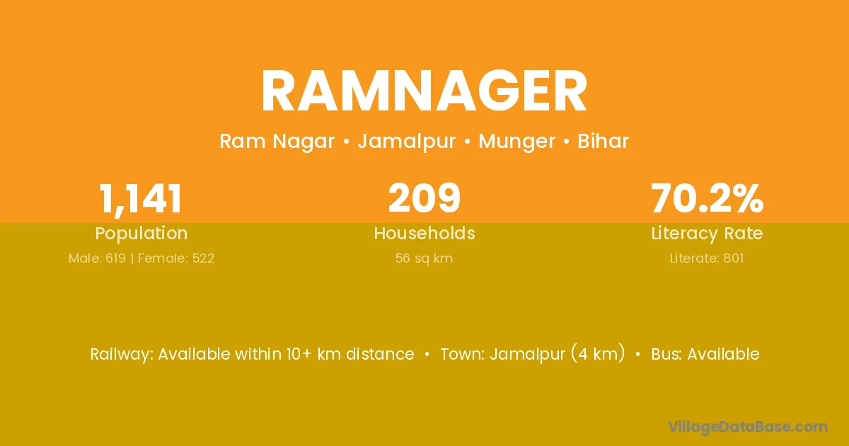 Jamalpur (4 km) is the nearest town to Ramnager village for major economic activities and is located approximately 4 km away.