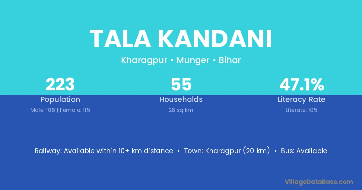 Kharagpur (20 km) is the nearest town to Tala Kandani village for major economic activities and is located approximately 20 km away.