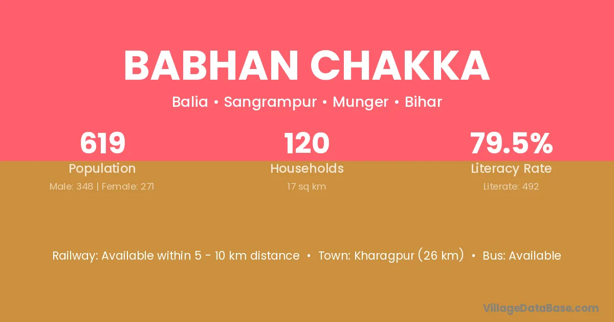 Kharagpur (26 km) is the nearest town to Babhan Chakka village for major economic activities and is located approximately 26 km away.