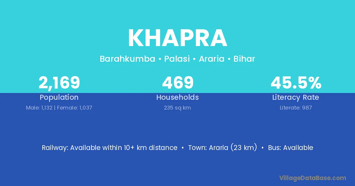 Kharagpur (20 km) is the nearest town to Khapra village for major economic activities and is located approximately 20 km away.