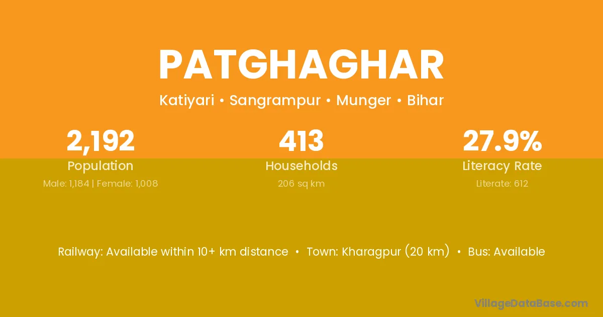 Kharagpur (20 km) is the nearest town to Patghaghar village for major economic activities and is located approximately 20 km away.