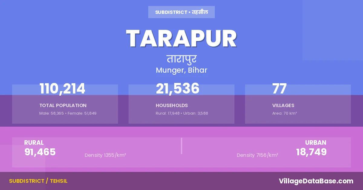 Tarapur is a town and Subdivision in the Munger district of the Bihar. In India, a Subdivision is a subdivision of a district responsible for the administration and revenue collection of a specific area within the district. Subdivisions play a crucial role in the local governance structure, contributing significantly to the development and administration of their communities.