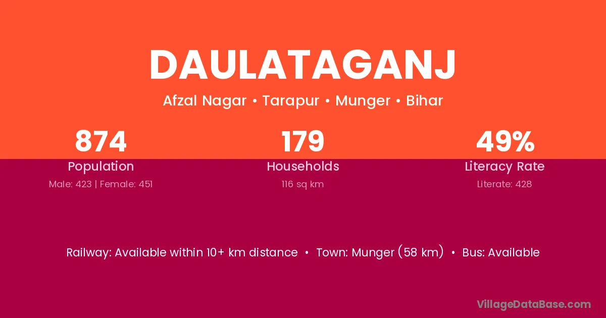 Munger (58 km) is the nearest town to Daulataganj village for major economic activities and is located approximately 58 km away.