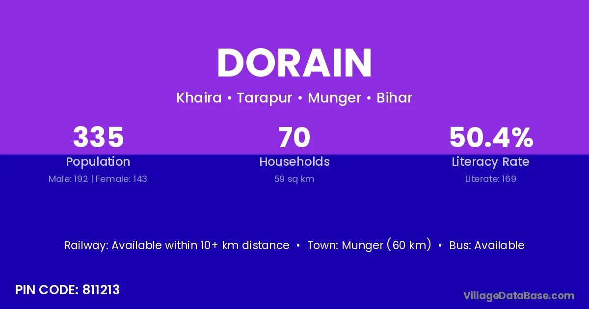 Munger (60 km) is the nearest town to Dorain village for major economic activities and is located approximately 60 km away.