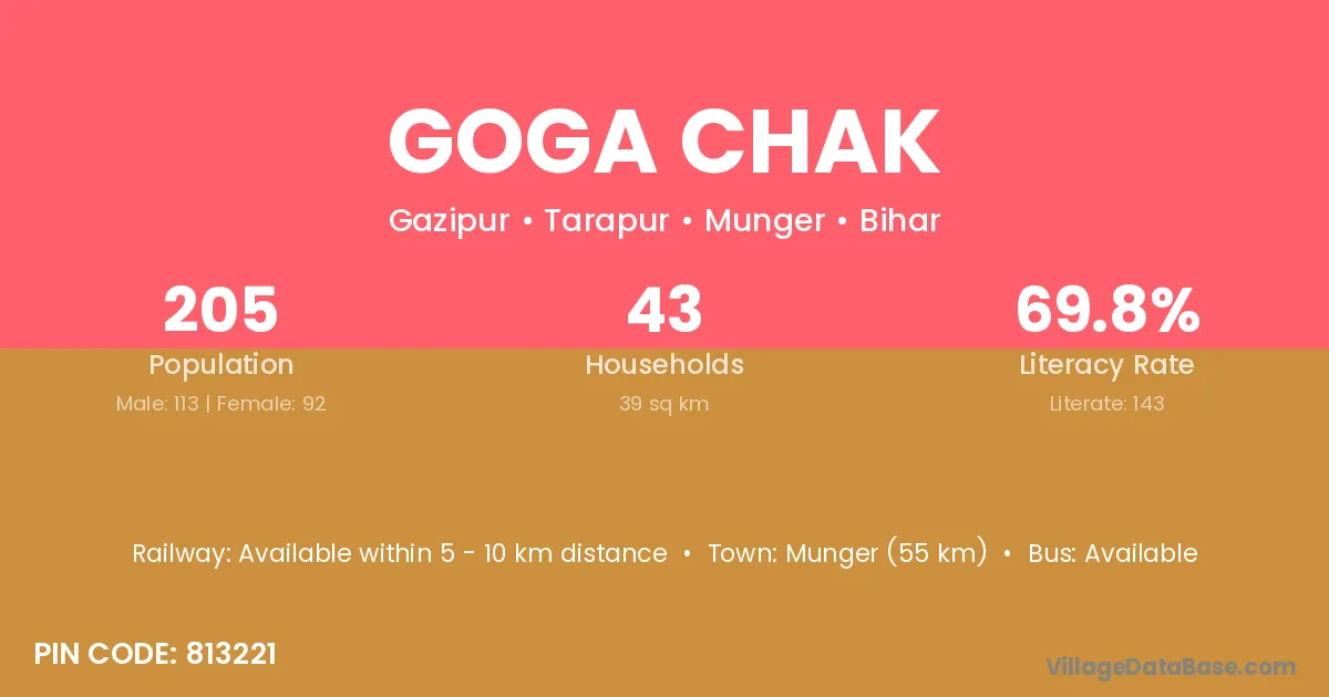 Munger (55 km) is the nearest town to Goga Chak village for major economic activities and is located approximately 55 km away.