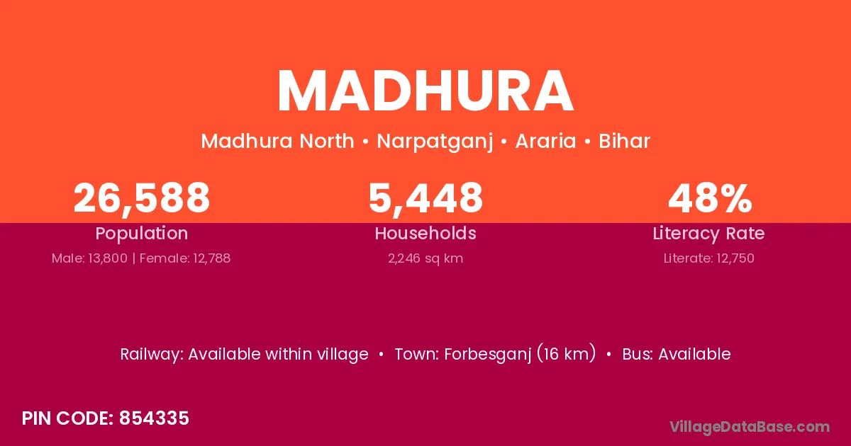 Munger (55 km) is the nearest town to Madhura village for major economic activities and is located approximately 55 km away.