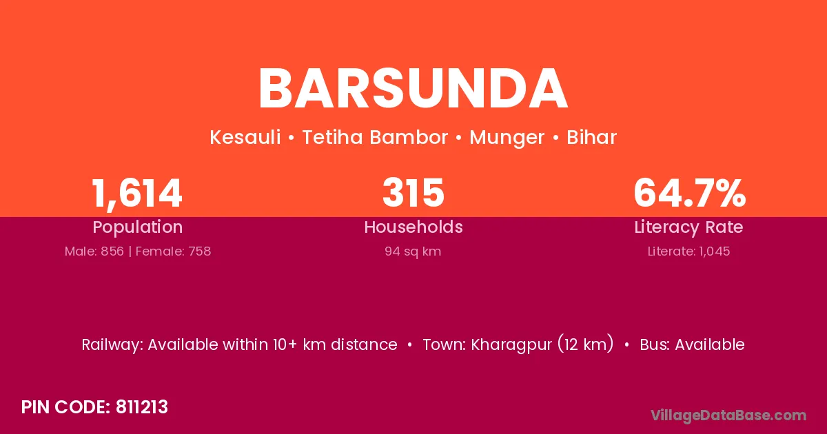 Kharagpur (12 km) is the nearest town to Barsunda village for major economic activities and is located approximately 12 km away.