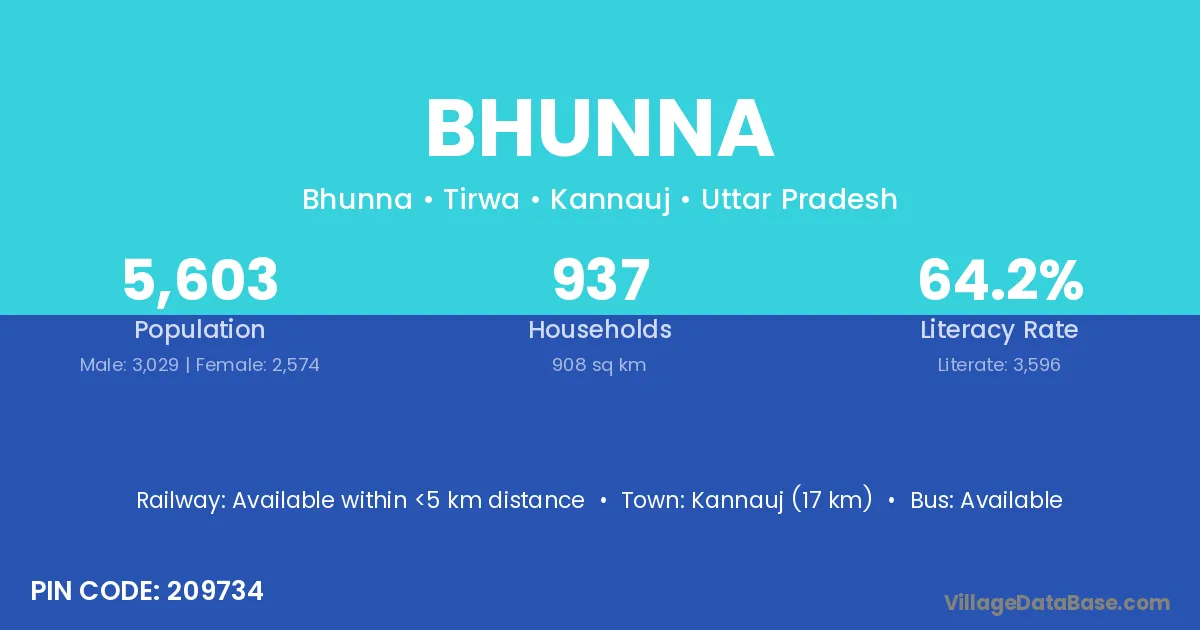 Bhunna village has a total population of 1,949 people, of which 1,068 are males and 881 are females.