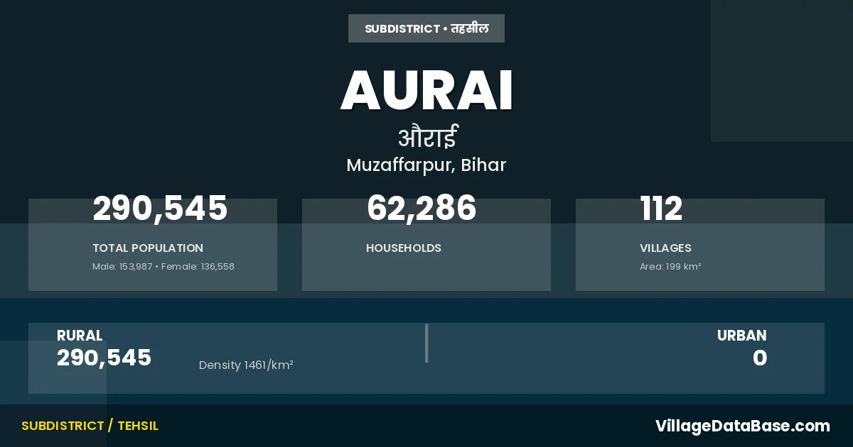 According to the 2011 census The total area of Aurai Subdivision is 199 km², with a population of 290545 people. The population density is 1,461 inhabitants per square kilometre, and there are approximately 62286 houses in the sub district.