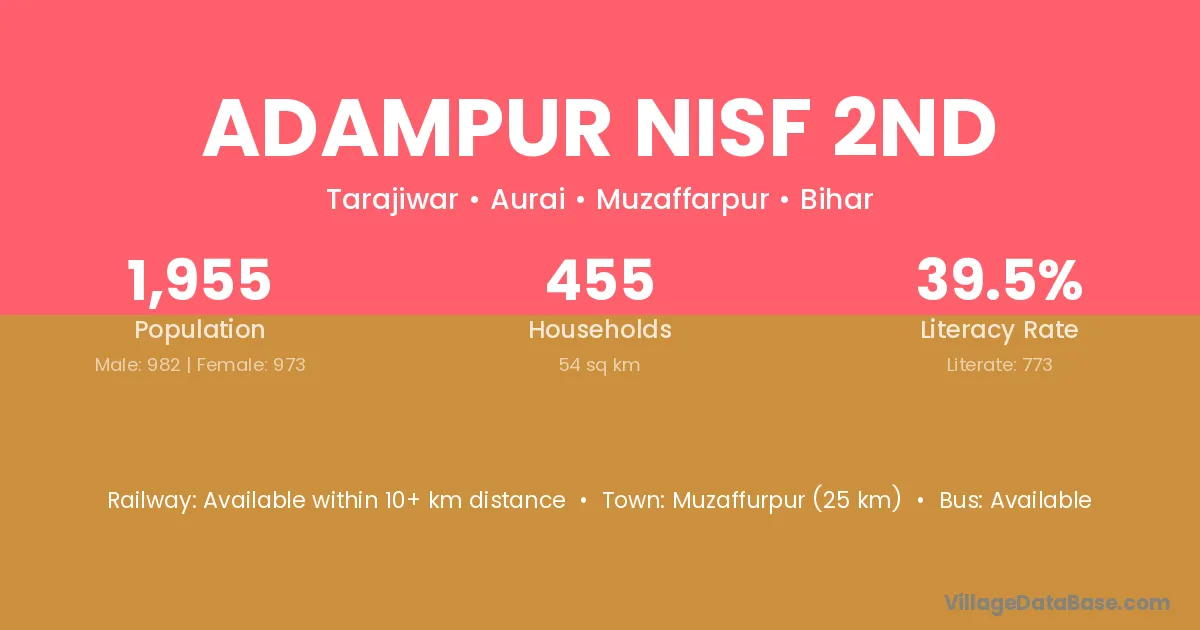 Muzaffurpur (25 km) is the nearest town to Adampur Nisf 2nd village for major economic activities and is located approximately 25 km away.