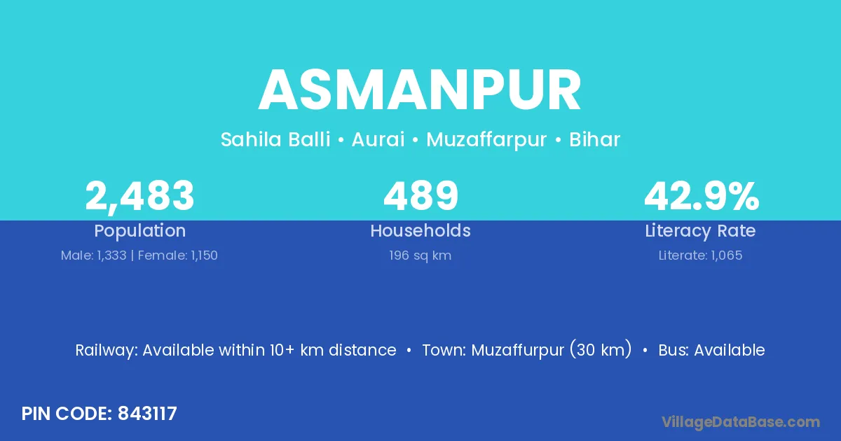 Muzaffurpur (30 km) is the nearest town to Asmanpur village for major economic activities and is located approximately 30 km away.