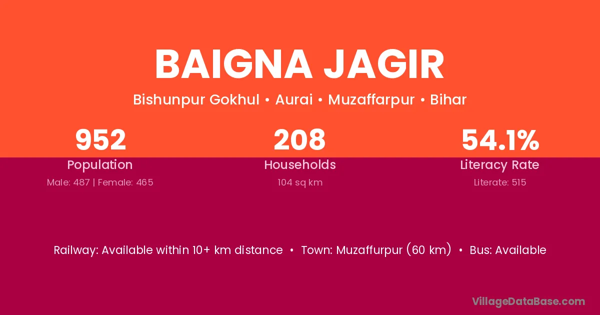 Muzaffurpur (60 km) is the nearest town to Baigna Jagir village for major economic activities and is located approximately 60 km away.