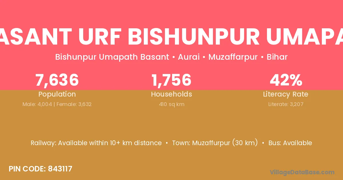 Basant Urf Bishunpur Umapat village has a total population of 7,636 people, of which 4,004 are males and 3,632 are females.