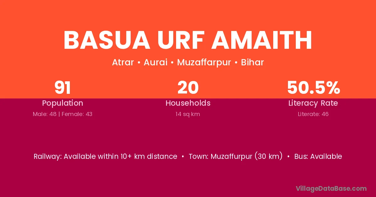 Muzaffurpur (30 km) is the nearest town to Basua Urf Amaith village for major economic activities and is located approximately 30 km away.