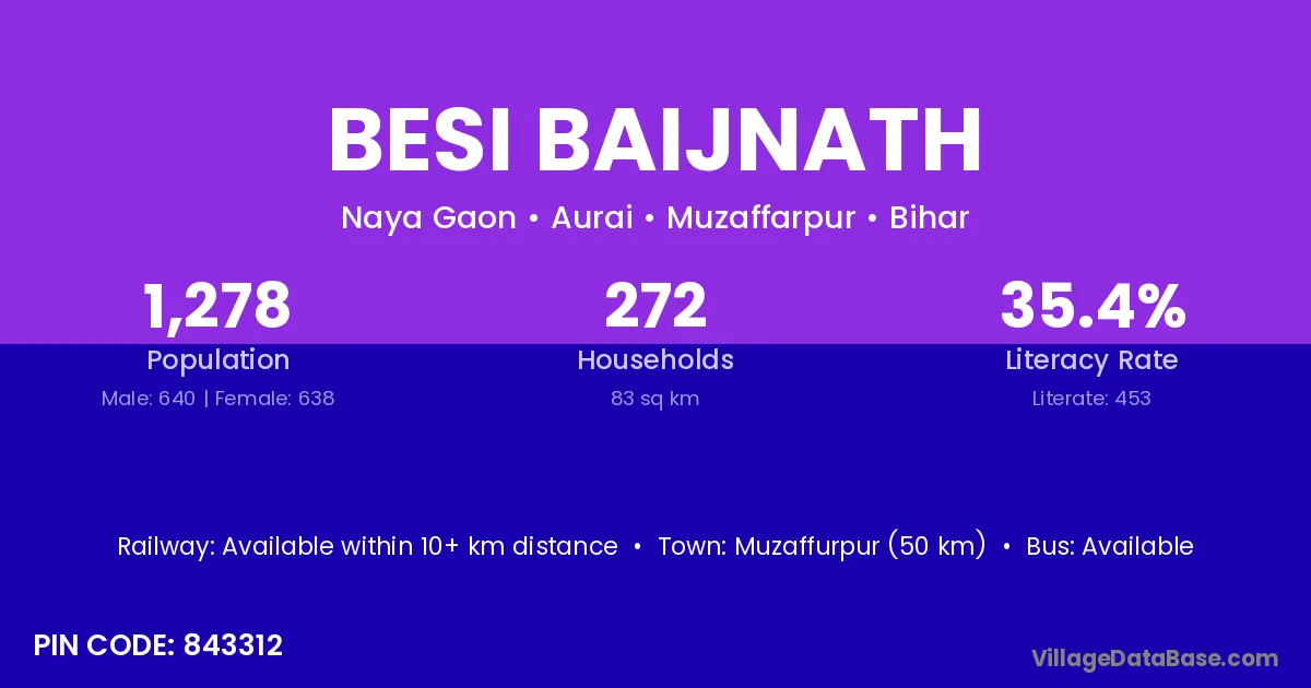 Muzaffurpur (50 km) is the nearest town to Besi Baijnath village for major economic activities and is located approximately 50 km away.