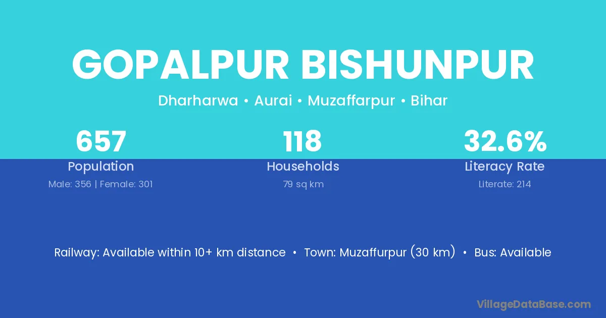 Gopalpur Bishunpur village has a total population of 657 people, of which 356 are males and 301 are females.