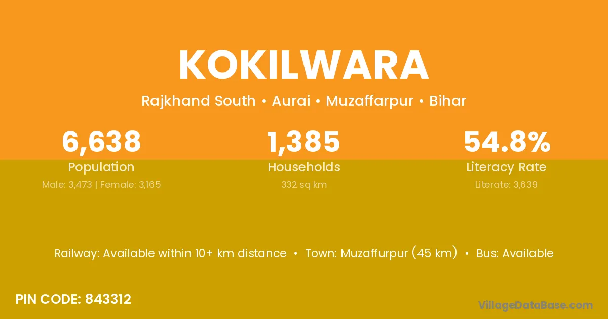 Muzaffurpur (45 km) is the nearest town to Kokilwara village for major economic activities and is located approximately 45 km away.
