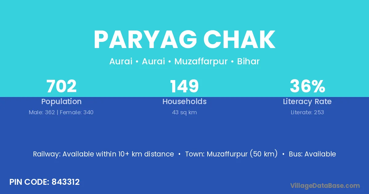 Muzaffurpur (50 km) is the nearest town to Paryag Chak village for major economic activities and is located approximately 50 km away.