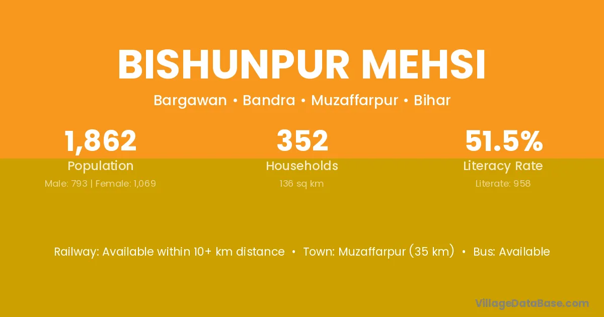 Bishunpur Mehsi village has a total population of 1,862 people, of which 793 are males and 1,069 are females.