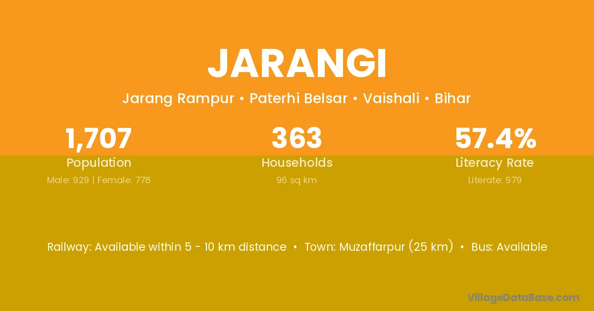 Muzaffarpur (30 km) is the nearest town to Jarangi village for major economic activities and is located approximately 30 km away.