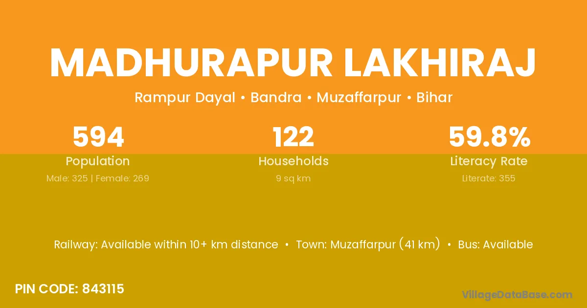 Madhurapur Lakhiraj village has a total population of 594 people, of which 325 are males and 269 are females.