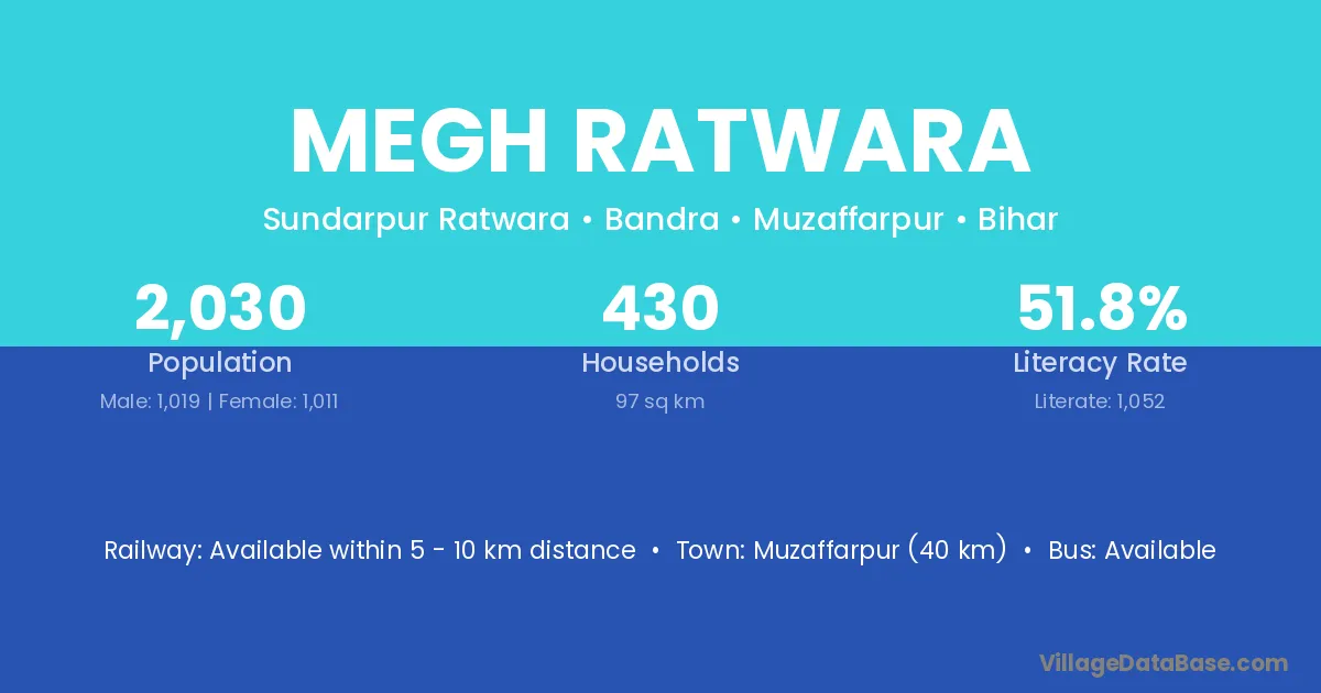 Muzaffarpur (40 km) is the nearest town to Megh Ratwara village for major economic activities and is located approximately 40 km away.